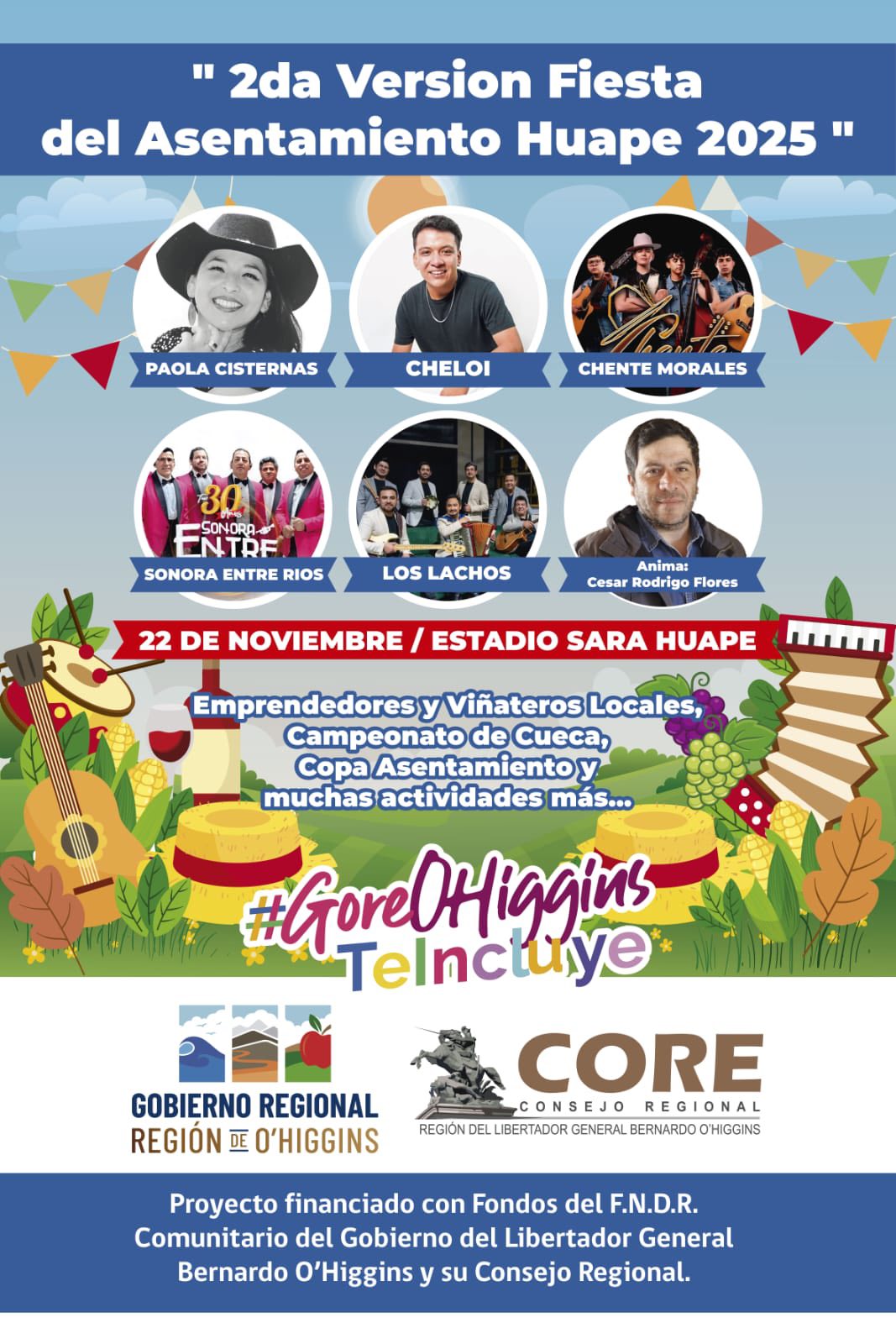 Será una jornada para disfrutar en familia: habrá emprendedores y viñateros locales, campeonatos de cueca, brisca y rayuela, junto con música en vivo de artistas como Paola Cisternas, Cheloi, La Dinastía Continúa con Chente Morales, Los Lachos y, para cerrar con alegría, La Sonora Entre Ríos, celebrando sus 30 años de trayectoria. La animación estará a cargo de César Rodrigo Flores.